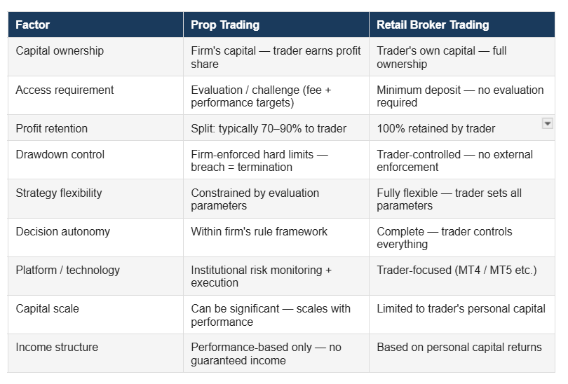 Prop trading and retail broker trading are not competing versions of the same model they are different structures with different requirements and different tradeoffs. The most useful question is not which is better in the abstract, but which is better suited to a specific trader's approach, risk tolerance, and goals.