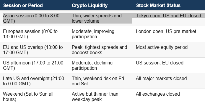 Crypto liquidity is deepest during the European and US session overlap, roughly 1:00 PM to 5:00 PM GMT, when institutional participation is highest and spreads are tightest. Execution during Asian session hours or weekends involves thinner liquidity and potentially higher slippage, particularly for larger orders or less liquid tokens.