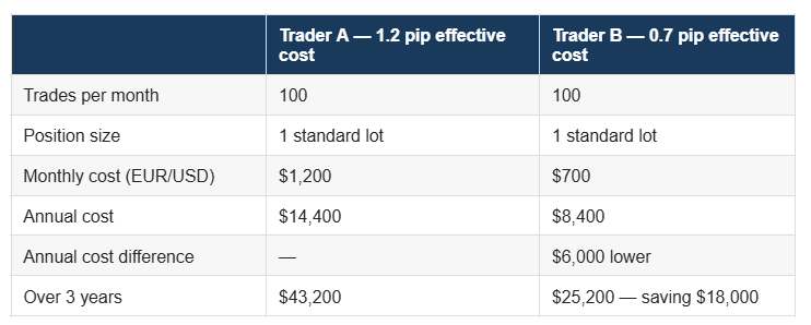 The strategy is identical. The market conditions are identical. The only variable is execution cost and over three years, a 0.5 pip difference in effective spread produces an $18,000 divergence in cumulative cost. For a trader with a $50,000 account, that represents 36 percent of their capital consumed by cost differential alone.